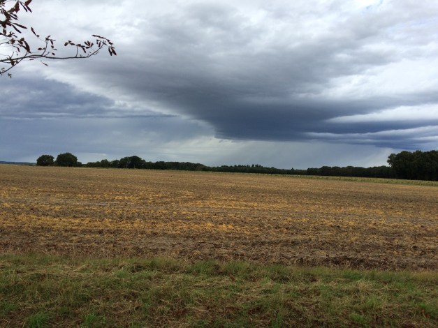 It was then, that thinking I may get away with one dry segment between the storms, there was a flash of lightning and a crack of thunder about 6 miles away. Pulse racing and keen to get off an exposed road across the fields, I rode hard to run along a river valley, when this storm hit. Hailstones the size of small grapes came cascading out of the sky, crashing against my helmet and stinging my exposed legs. As I cycled through a small farm, whose barn roofs were made of corregated iron, the noise was deafening. As quickly as it came. within 10 minutes it stopped – the sun trying to get through even when the storm was at its fiercest.